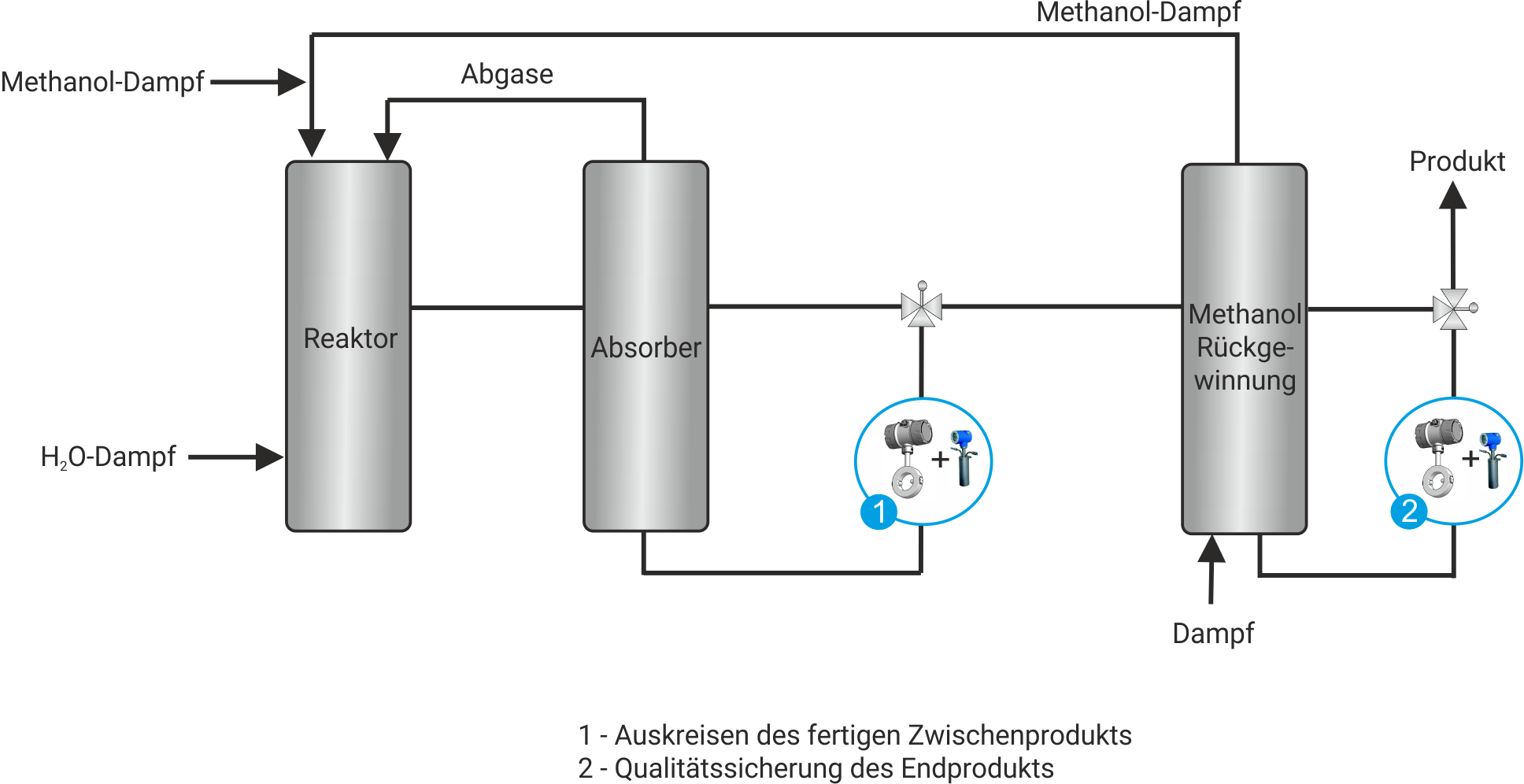Die Formaldehydproduktion stellt hohe Anforderungen an die Prozessführung, da bereits kleine Abweichungen in der Methanoloxidation spürbare Auswirkungen auf Effizienz, Produktqualität und Anlagenzustand haben. Häufig fehlt eine kontinuierliche Transparenz über die tatsächliche Zusammensetzung des flüssigen Produktstroms, sodass Veränderungen erst mit zeitlicher Verzögerung erkannt werden können. Schwankende Restgehalte deuten auf nachlassende Katalysatoraktivität hin, während eine unvollständige oder instabile Reaktion beispielsweise zur Bildung von Ameisensäure führen kann. Unerwünschte Nebenprodukte und unvollständige Reaktionen wirken sich nicht nur negativ auf die Formaldehydqualität aus, sondern erhöhen auch Korrosionsrisiken und den Wartungsaufwand der Anlage.